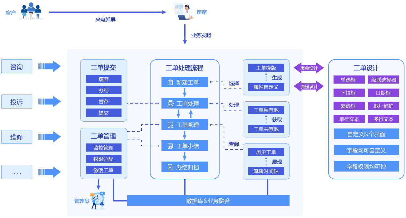支持在用戶致電、在線咨詢時創(chuàng)建工單話后也可隨時補單。
