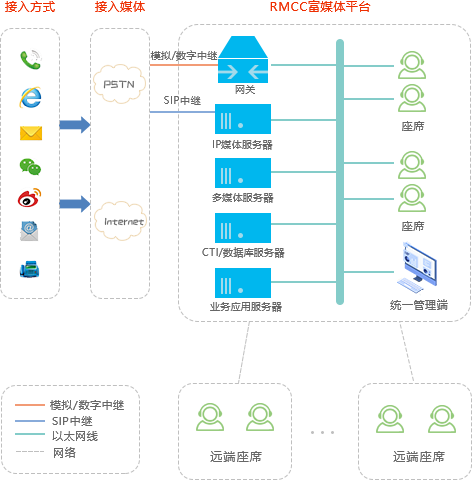 方案采用RMCC富媒體聯(lián)絡(luò)中心平臺(tái)進(jìn)行建設(shè),RMCC富媒體聯(lián)絡(luò)中心平臺(tái)集電話、短信、傳真、WebCall、微信、微博、Email等多媒體應(yīng)用為一體,提供語音交換、ACD功能及CTI中間件、IVR、錄音和統(tǒng)計(jì)等功能,針對(duì)媒體接入終端進(jìn)行統(tǒng)一接入、統(tǒng)一路由、統(tǒng)一處理、統(tǒng)一管理。